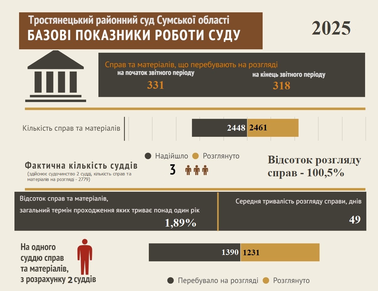 Базові показники роботи Тростянецького районного суду Сумської області за 2025 рік: